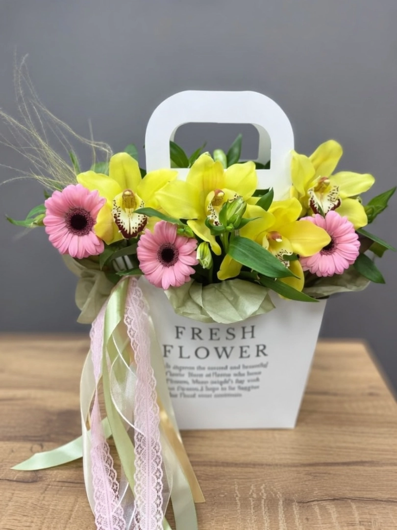 - В виде шикарной настольной композиции или цветов с подарком.