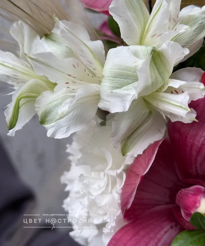 2. **Свежесть цветов.** Все растения выглядят безупречно: бутоны упругие, листья сочные, нет признаков увядания. Спустя неделю букет по‑прежнему радует глаз.