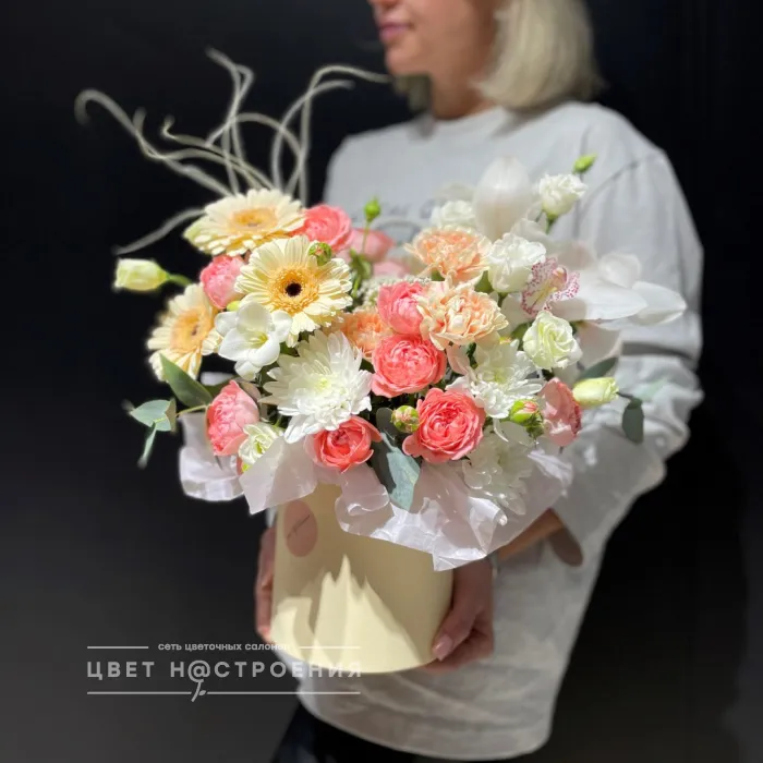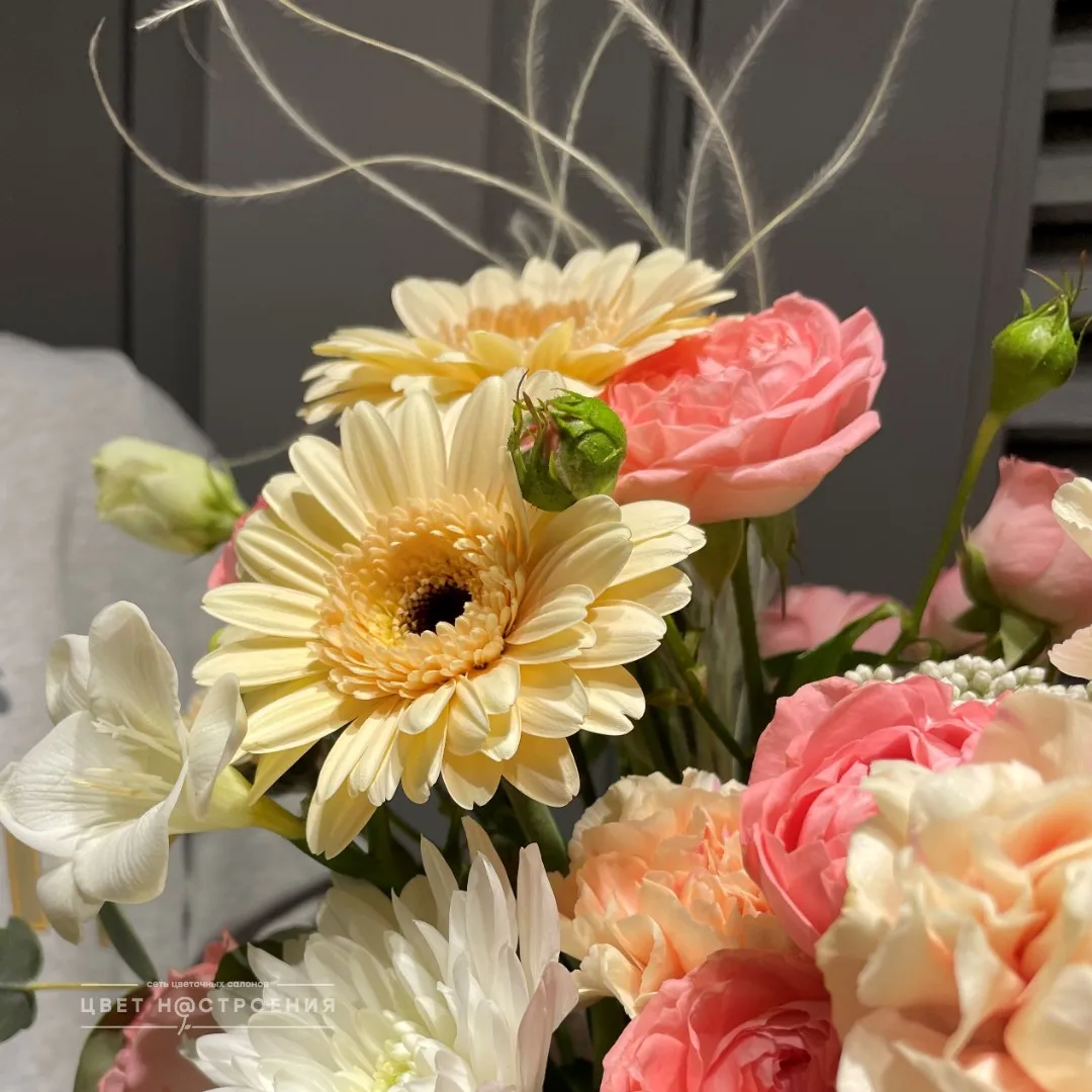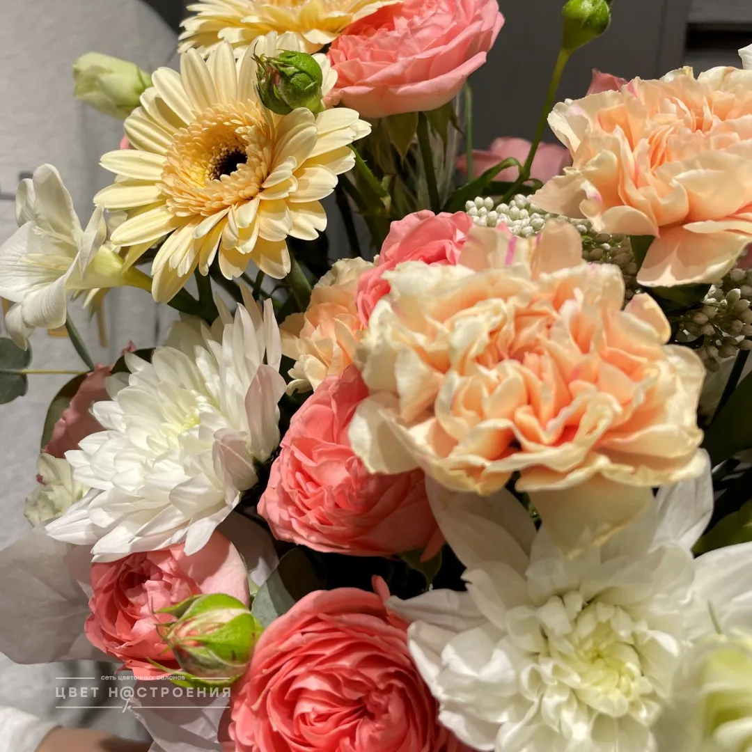 Уже несколько лет подряд заказываю в этом салоне букеты, результат неизменно радует. В этот раз выбирала букет для мамы на День рождения из четырёх вариантов, мне сотрудница салона по Whatsapp помогла сократить этот список до Зефирного - как она сказала, букет будет ароматным и интересно оформленным. Утром перед доставкой прислали фото собранного букета для подтверждения.