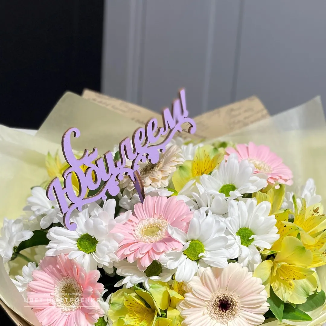 Уже несколько лет подряд заказываю в этом салоне букеты, результат неизменно радует. В этот раз выбирала букет для мамы на День рождения из четырёх вариантов, мне сотрудница салона по Whatsapp помогла сократить этот список до Зефирного - как она сказала, букет будет ароматным и интересно оформленным. Утром перед доставкой прислали фото собранного букета для подтверждения.