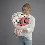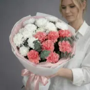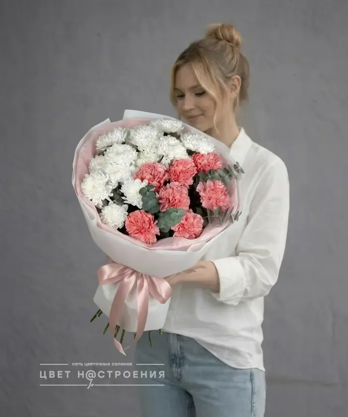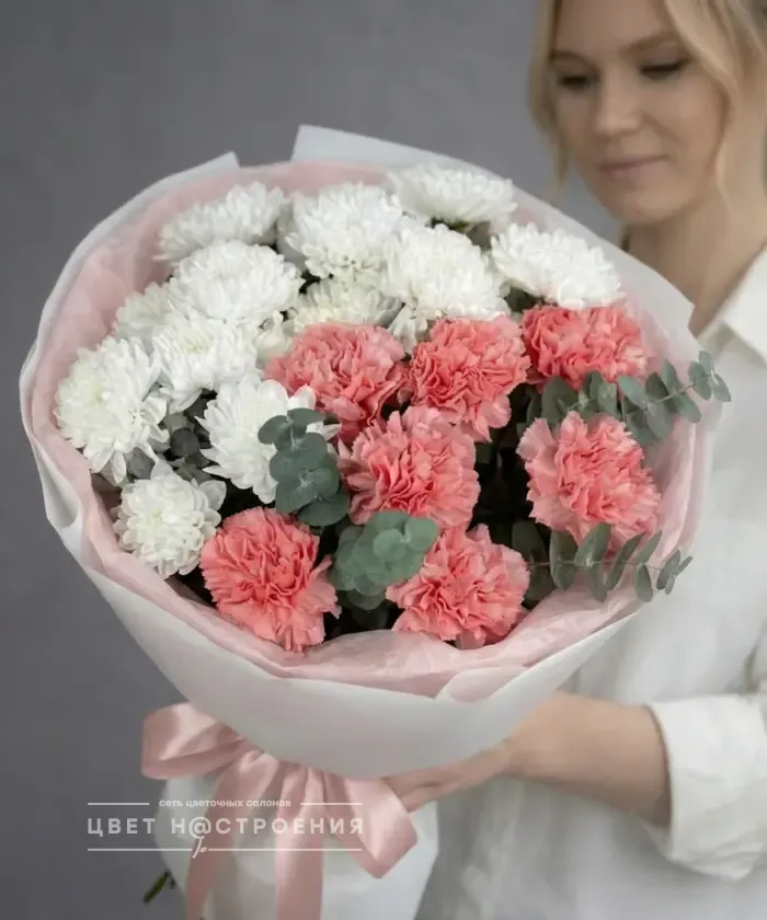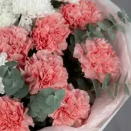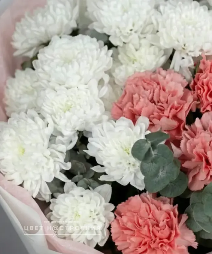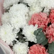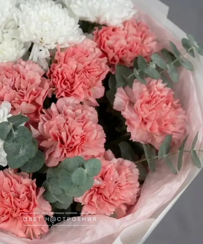 Букет «Свежий взгляд» порадует вас ярким сочетанием гвоздик и кустовых хризантем, гармонично дополненных свежим эвкалиптом. Стильная упаковка и аккуратная лента делают этот букет идеальным подарком для любого случая. Создайте атмосферу уюта и радости с этим свежим и элегантным цветочным composite.