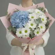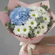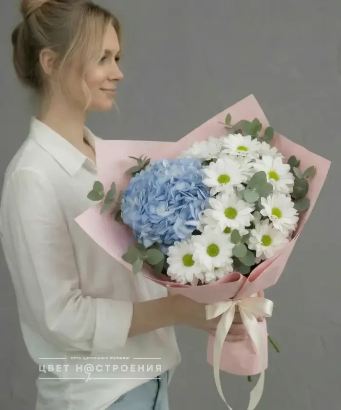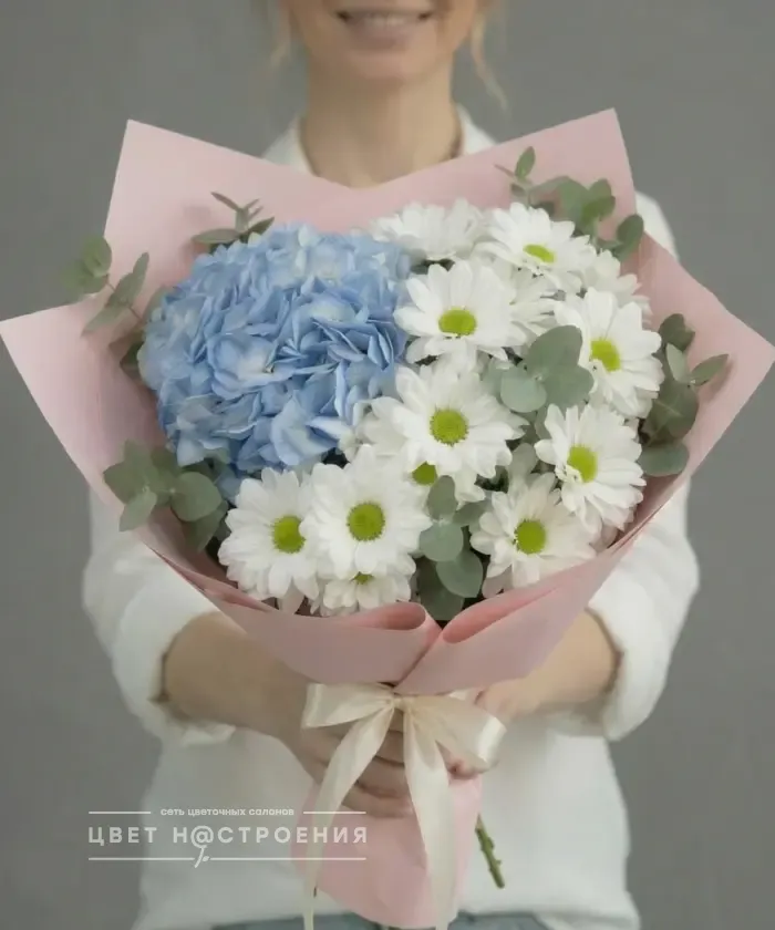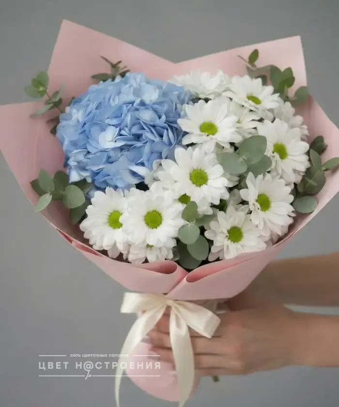 Тихий жест — букет без слов, но с глубоким смыслом. Голубая гортензия, белые хризантемы и эвкалипт в нежной упаковке. Для тех, кто говорит делом.