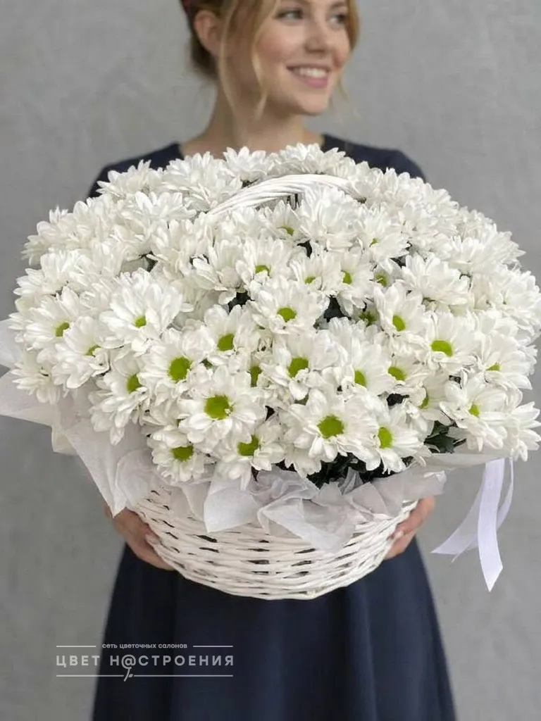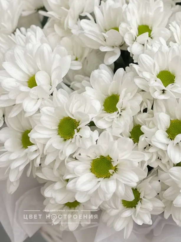 «Белый бал» удивляет своей элегантностью и утонченностью. В составе композиции — изящная кустовая хризантема, которая придает букету объем и мягкость.