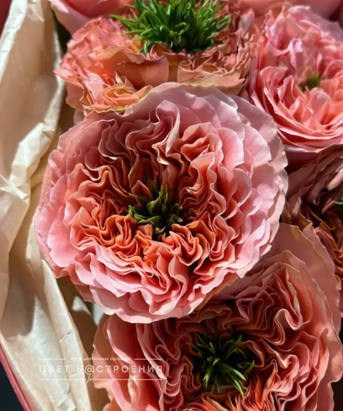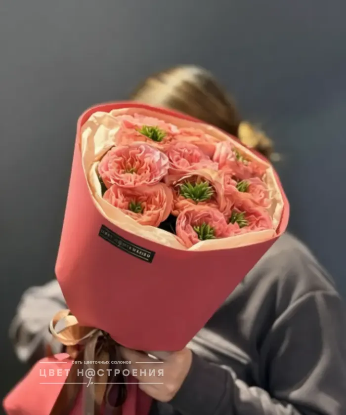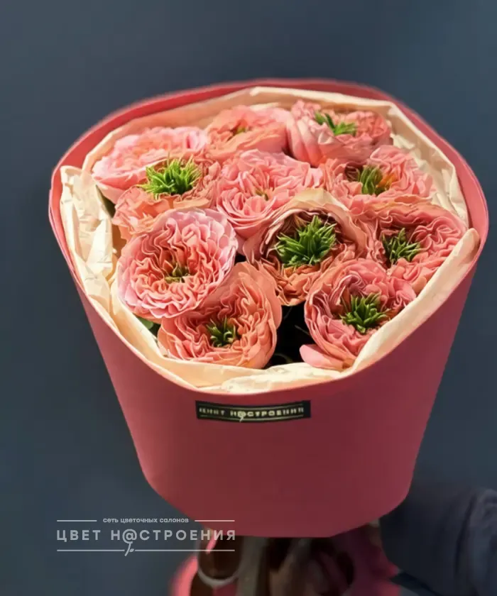 11 пионовидных роз Мандарин экспрешен в упаковке